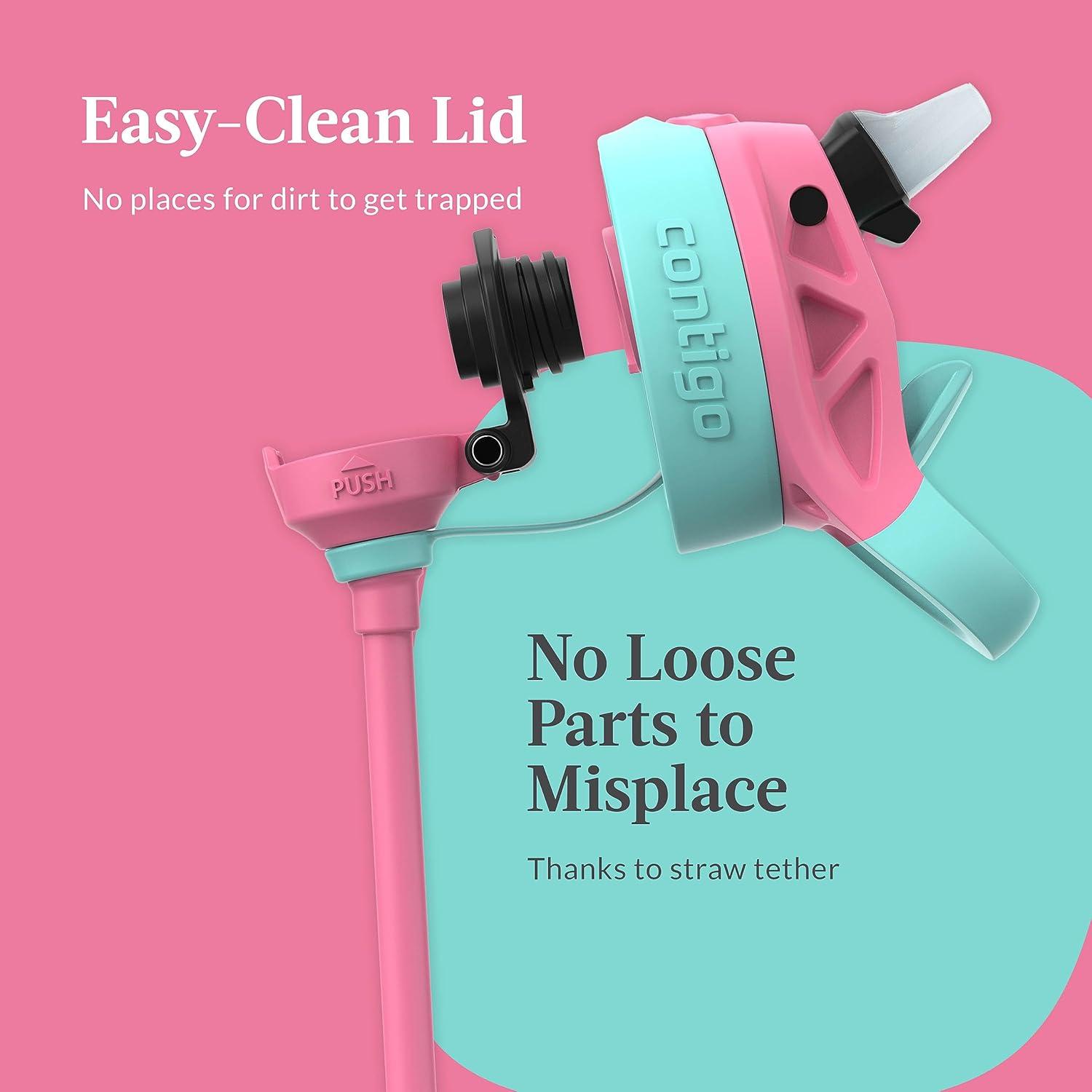 Fret no more, the Contigo Kids AUTOSPOUT Straw Water Bottle with Easy-Clean Lid has come to the rescue! Kids get a kick out of pressing a button to open the pop-up straw for effortless one-handed drinking, and they can easily push the spout under the cover to protect the mouthpiece from the elements. Adults appreciate that the straw features a spill-proof valve so car seats and tables are safe from spills—even if little ones hold the bottle upside down. When it's time to clean up, you’ll be happy to know that all parts are top-rack dishwasher-safe, the lid easily disassembles for full-access cleaning, and the lid is designed to eliminate all nooks and crannies in which dirt and grime might accumulate. Rest assured, your new water bottle comes with a lifetime guarantee, BPA-free materials that won’t give off plastic tastes. For ages 3 and up.