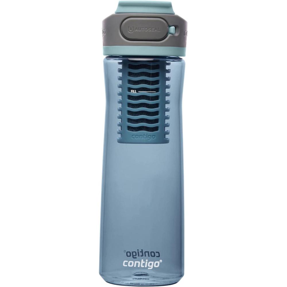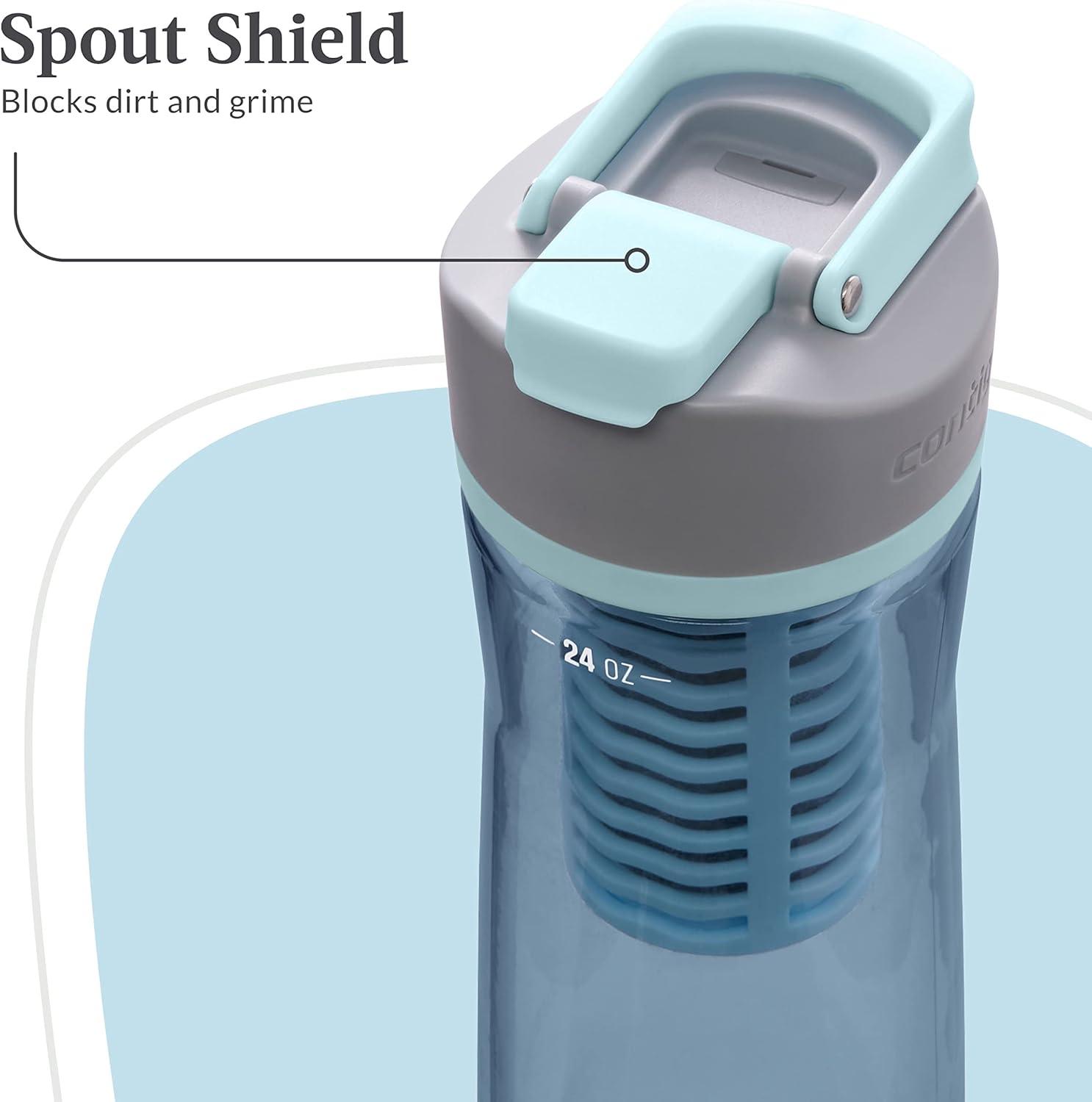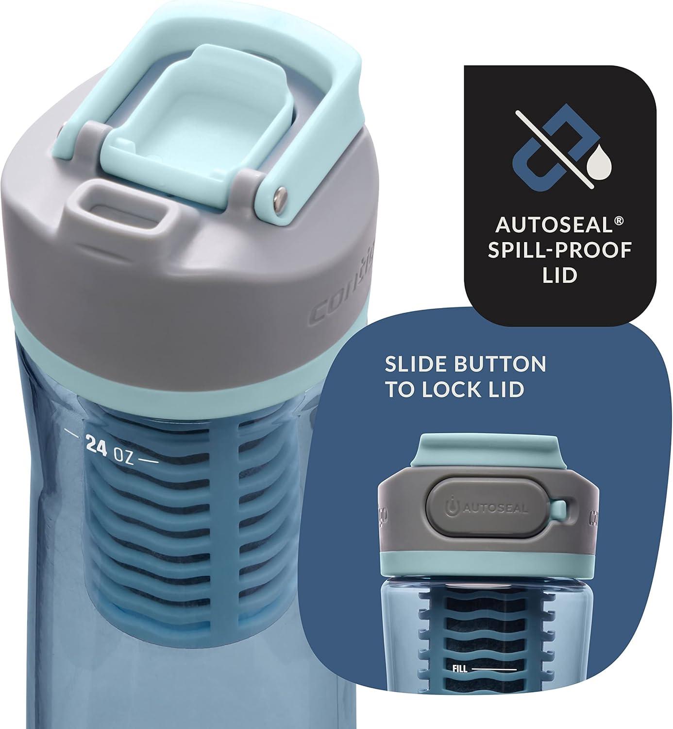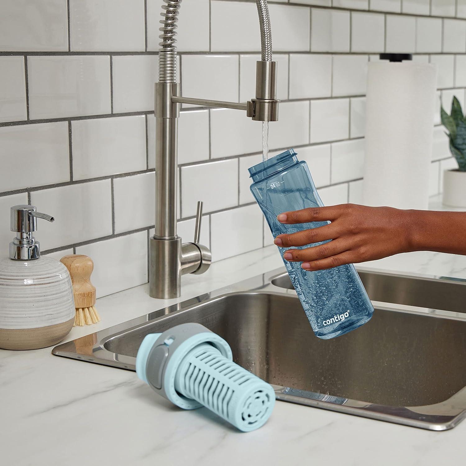Stay refreshed effortlessly with the Contigo Clybourn FreeFlow Filter Water Bottle, equipped with superior AUTOSEAL technology to prevent spills and leaks. This 24oz water bottle offers an advanced free-flow design that filters your water as you drink, enriching your hydration experience with clean, great-tasting water. Produced with carbon filter fiber technology, it significantly diminishes chlorine taste and odor. It lasts 4-6 months or 80 gallons and saves up to 600 single-use 16.9 fl. oz. water bottles, promoting a more sustainable lifestyle. Its design ensures simplicity, with an integrated handle for easy portability and a one-handed operation.